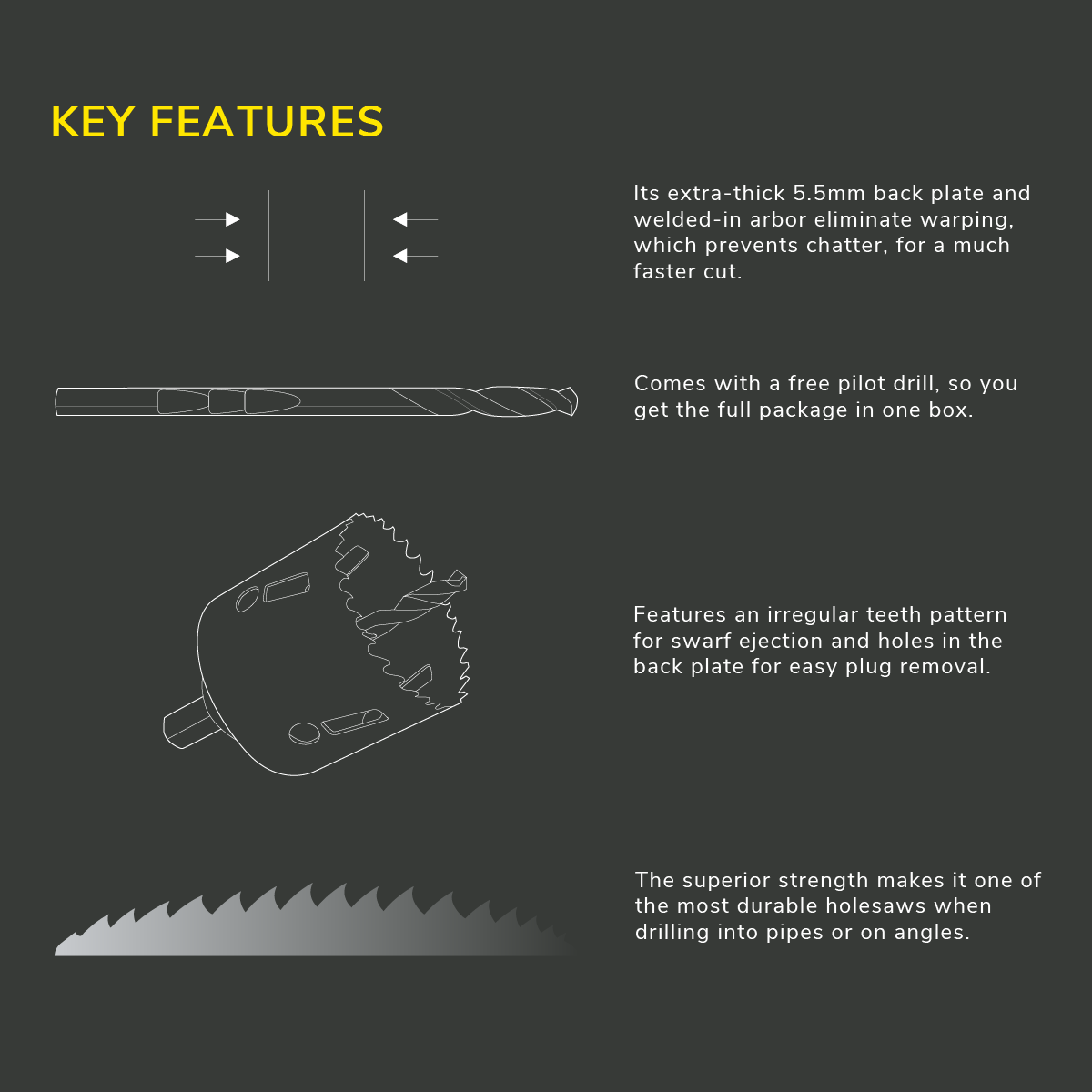 An irregular tooth pattern improves swarf ejection during cutting, while holes in the back plate allow for easy plug removal. Supplied with a free pilot drill, this hole saw comes as a complete package in one box, ready for immediate use. The built-in arbor design also allows for quick and easy changes between sizes.